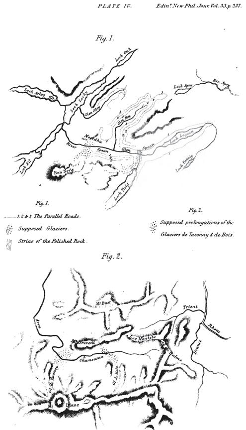 "Extract from a letter from Professor Agassiz to Professor Jameson . . . I discovered the most distinct morains [sic] and polished rocky surfaces, just as in the valleys of the Swiss Alps, in the region of existing glaciers; so that the existence of glaciers in Scotland at early periods can no longer be doubted.” He continued: “The parallel roads of Glen Roy are intimately connected with this former occurrence of glaciers, and have been caused by a glacier from Ben Nevis. The phenomenon must have been precisely analogous to the glacier-lakes of the Tyrol, and to the event that took place in the valley of Bagne. It appeared to me that you would be glad to be able to announce, for the first time, in your extensively read journal, the intelligence of the discovery of so important a geological fact.”